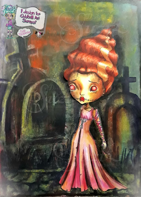 Today it is my pleasure to share with you my latest creation in my large Art Journal. I've used one of my favourite spooky images by Lizzy, the wonderful 'Bride of Frankenstein'